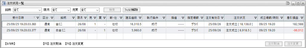 金白金鞘の拡大の仕掛け金ミニ買い1枚-白金ミニ売1枚を1組を利確しています。