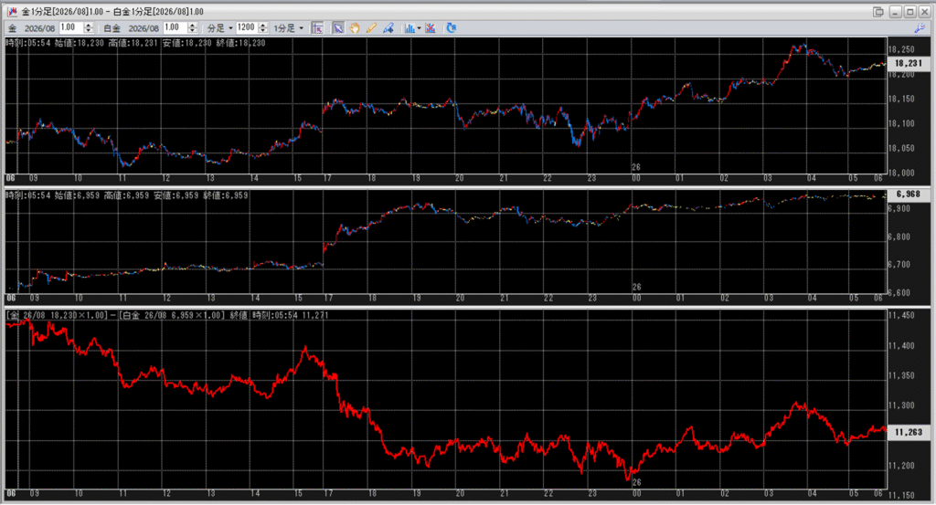 下:金白金鞘(金白金の価格差 = 金1グラムの価格 - 白金1グラムの価格)
