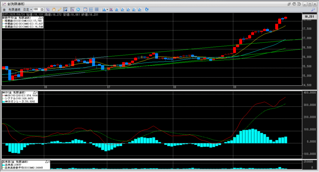 短期線を大きく超え、このまま金価格上昇は続くのか。