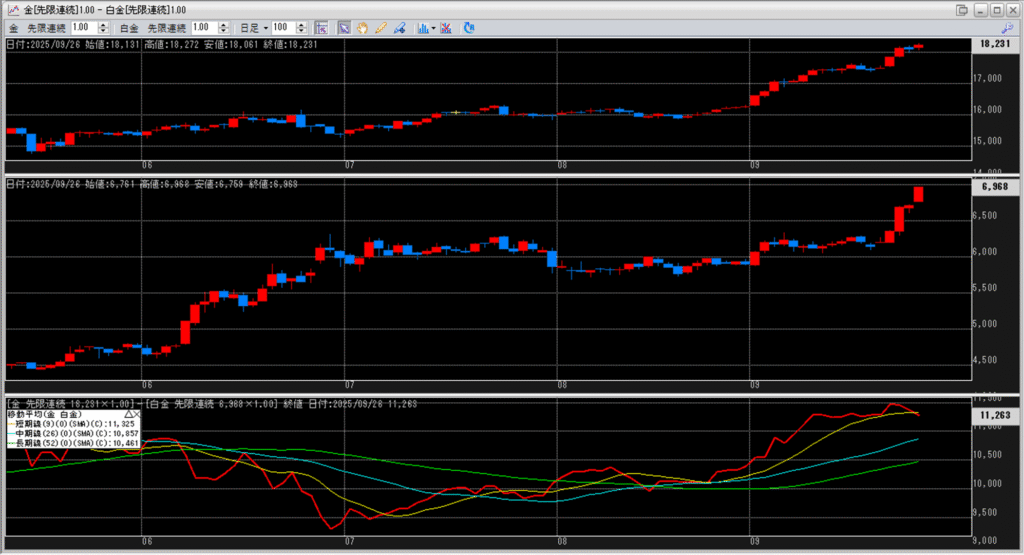 下記に金白金鞘の移動平均線のチャートを貼り付けています。
