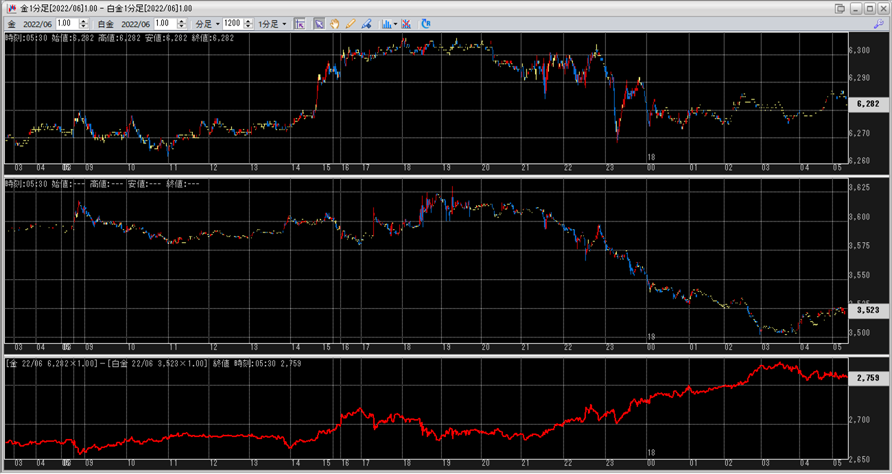 現在、鞘の仕掛けは、鞘拡大の仕掛け金買い1枚-白金売り2枚で