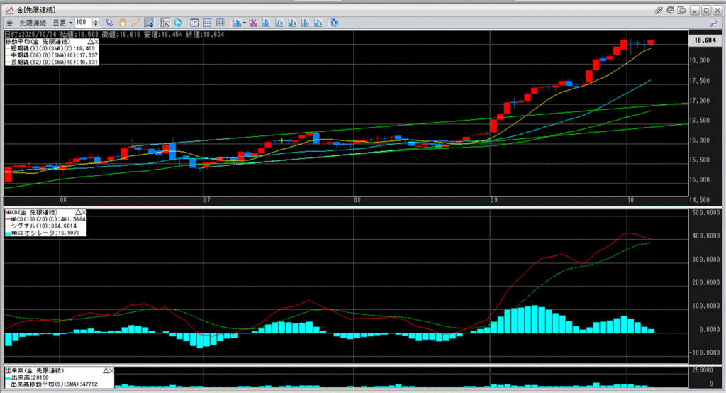 金価格は、6:00時点での終値は18,604円となっています。