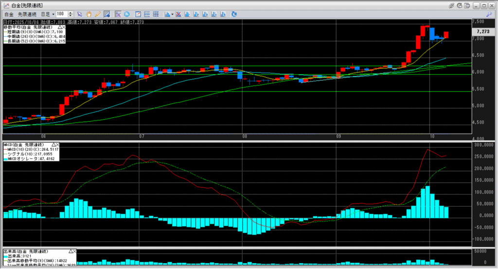 白金価格の2008年3月6日高値7,427円を超えてきました。