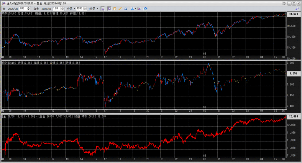 下:金白金鞘(金白金の価格差 = 金1グラムの価格 - 白金1グラムの価格)