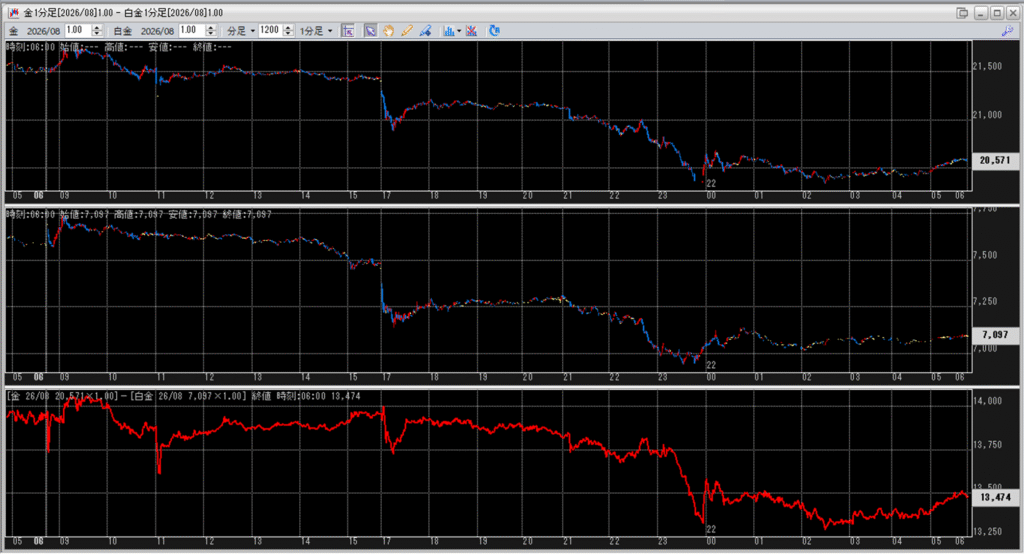 下:金白金鞘(金白金の価格差 = 金1グラムの価格 - 白金1グラムの価格)