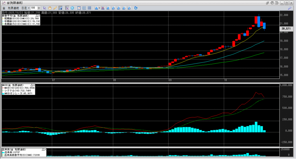 移動平均線の一番上に位置している短期線20,744円を割り込んで、