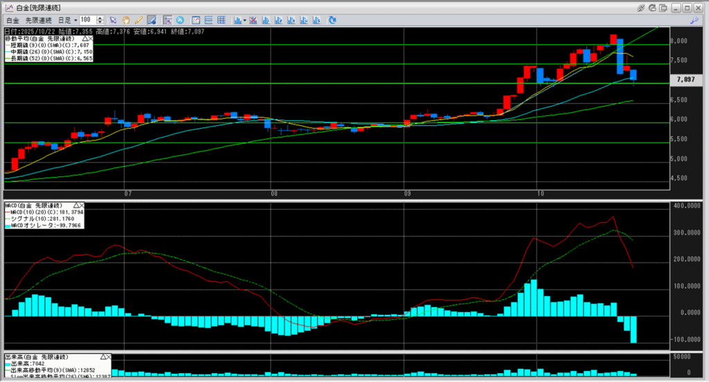 白金価格はMACDの動きに併せて、下落していってしまうのか。