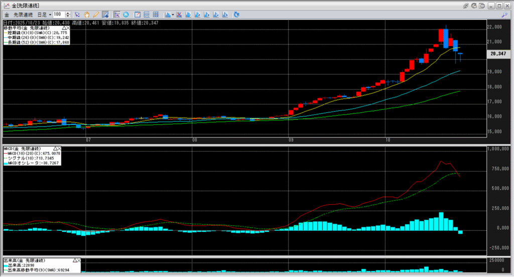 移動平均線の一番上に位置している短期線20,775円を割り込んで、