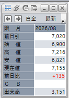 白金の値段は、6:00の終値で7,155円となっており、