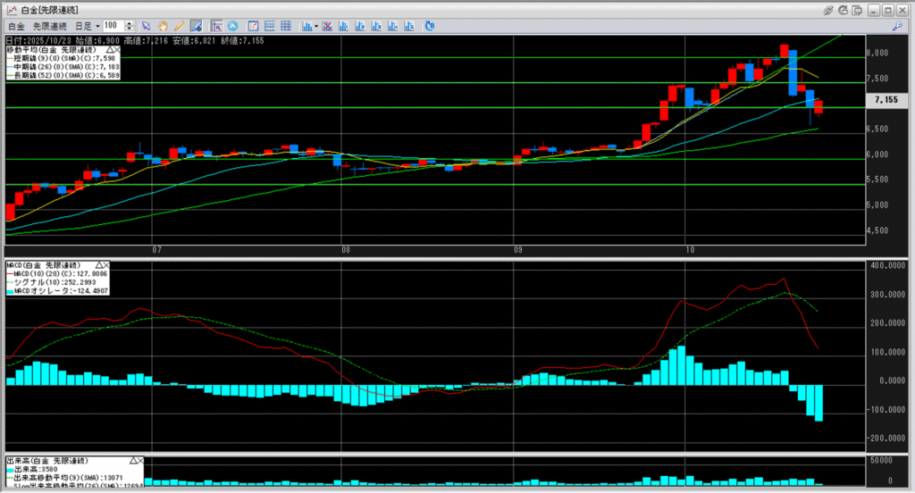 白金価格はMACDの動きに併せて、下落していってしまうのか。