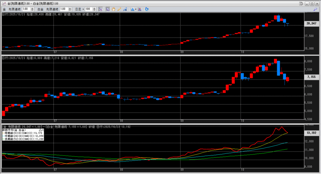 下記に金白金鞘の移動平均線のチャートを貼り付けています。