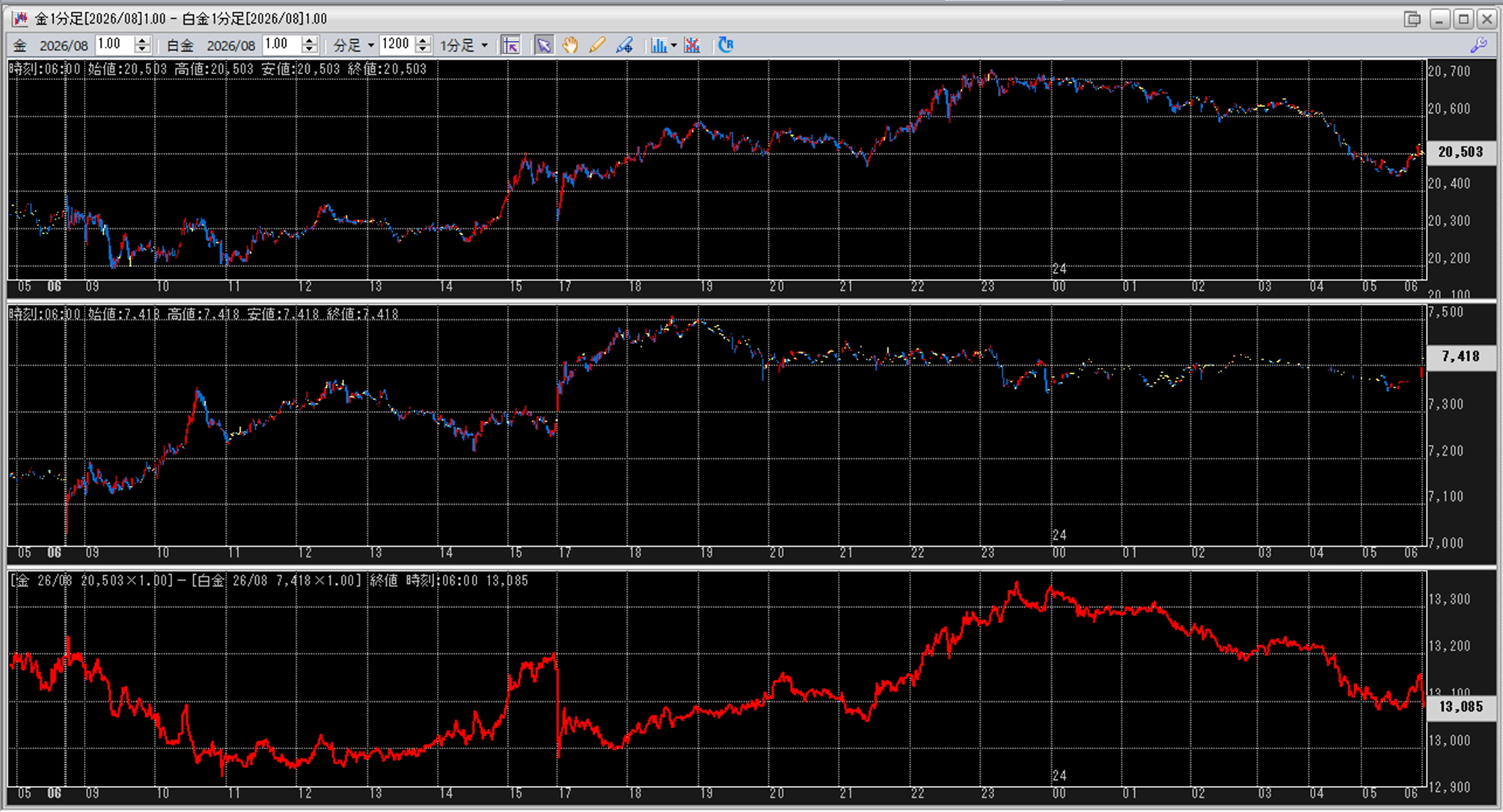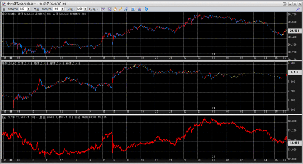 下:金白金鞘(金白金の価格差 = 金1グラムの価格 - 白金1グラムの価格)