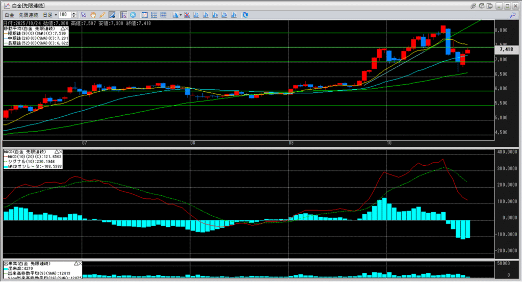 白金価格は、7000円台を維持し、中期線も超えてきました。