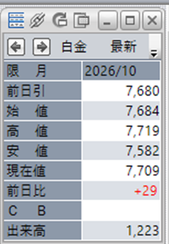 白金の値段は、6:00の終値で7,709円となっており、