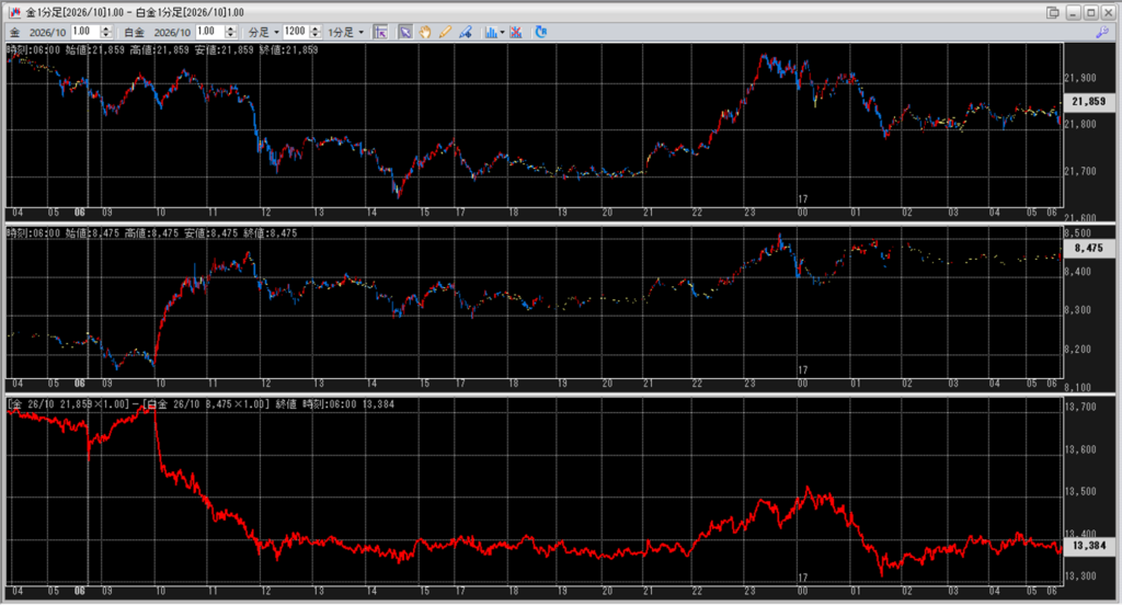 下:金白金鞘(金白金の価格差 = 金1グラムの価格 - 白金1グラムの価格)