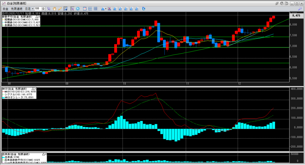 ボックス相場の上値7,500円を超えてから白金価格は上昇傾向が続いています。