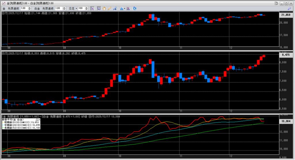 下記に金白金鞘の移動平均線のチャートを貼り付けています。
