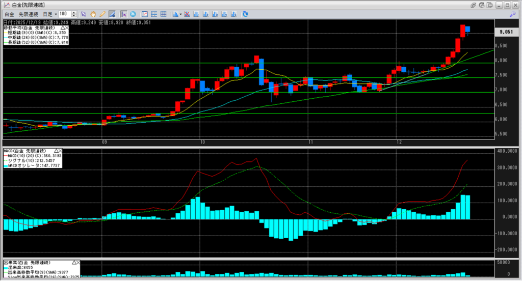 ボックス相場の上値7,500円を超えてから白金価格は上昇傾向が続いています。
