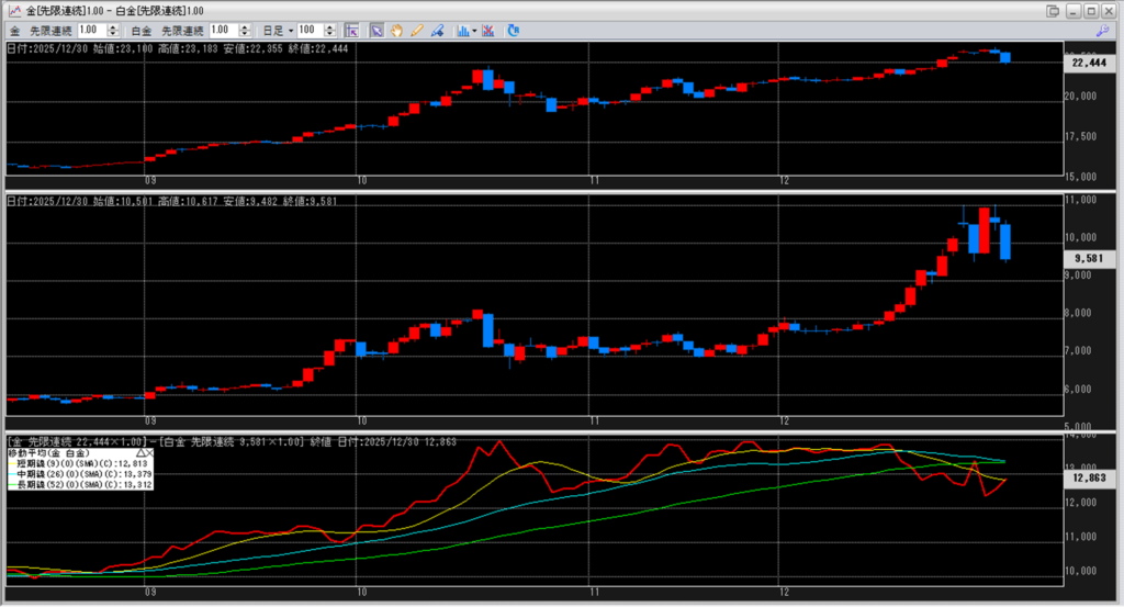 下記に金白金鞘の移動平均線のチャートを貼り付けています。