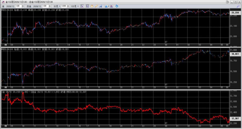 下:金白金鞘(金白金の価格差 = 金1グラムの価格 - 白金1グラムの価格)
