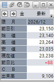 -1σである12,604円を割り込んだ12,307円で6:00の取引を終えています。