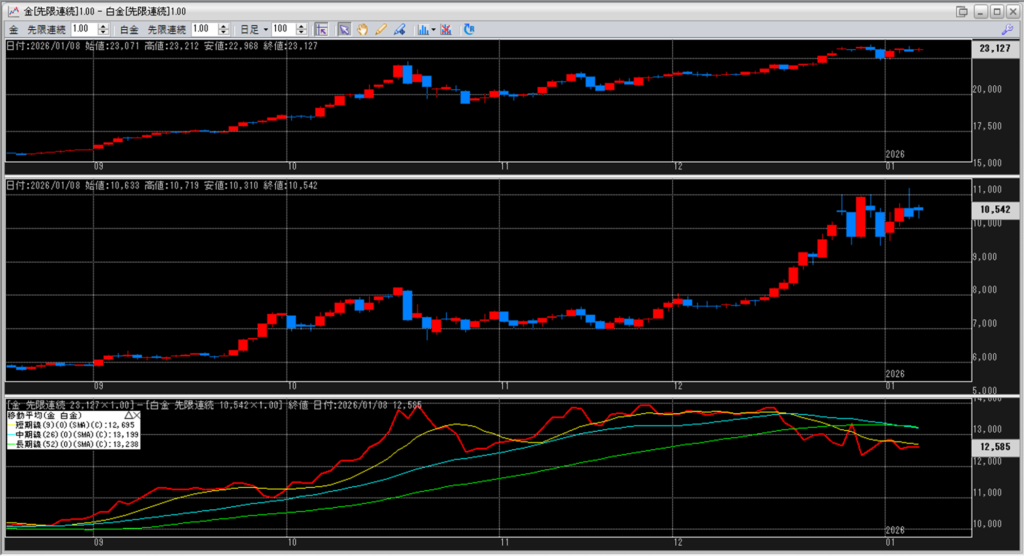 下記に金白金鞘の移動平均線のチャートを貼り付けています。