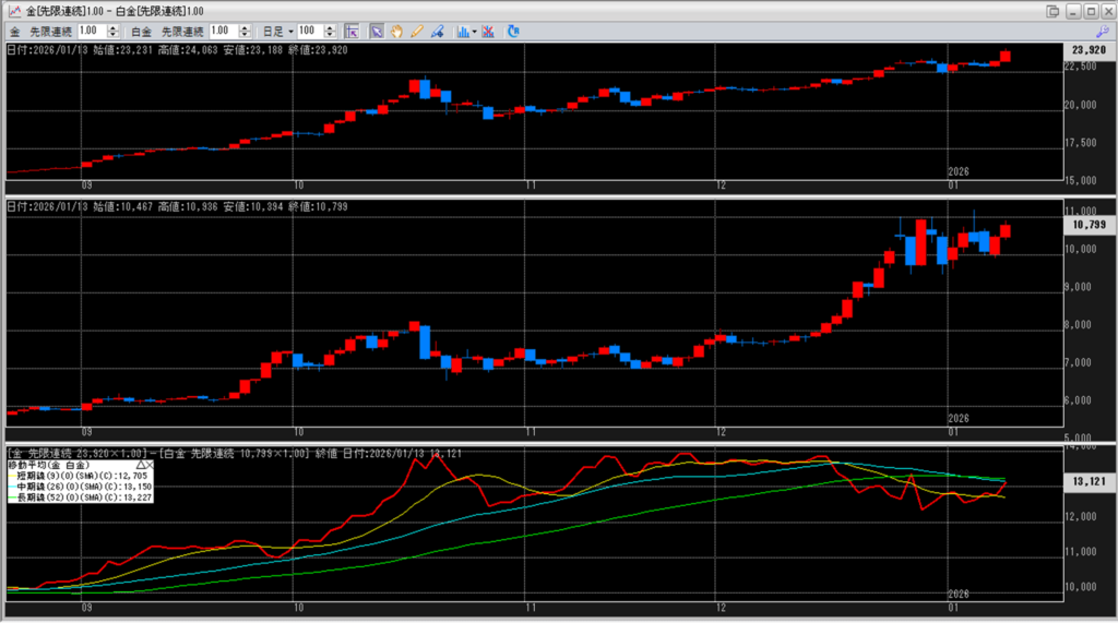 下記に金白金鞘の移動平均線のチャートを貼り付けています。