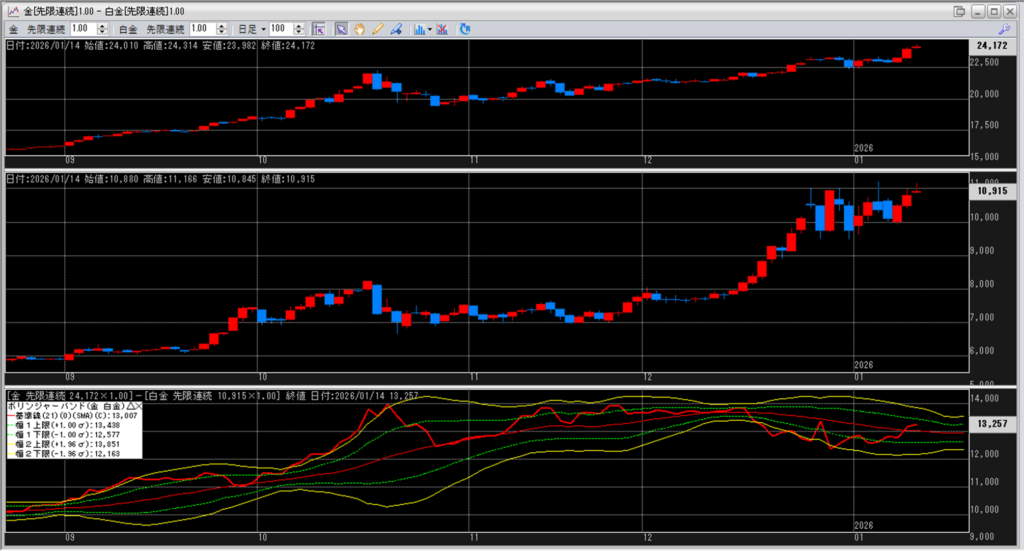 金白金の鞘をボリンジャーバンドで見ていきます。