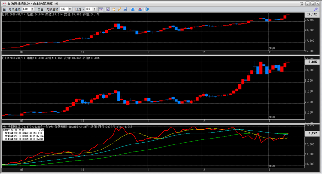 下記に金白金鞘の移動平均線のチャートを貼り付けています。