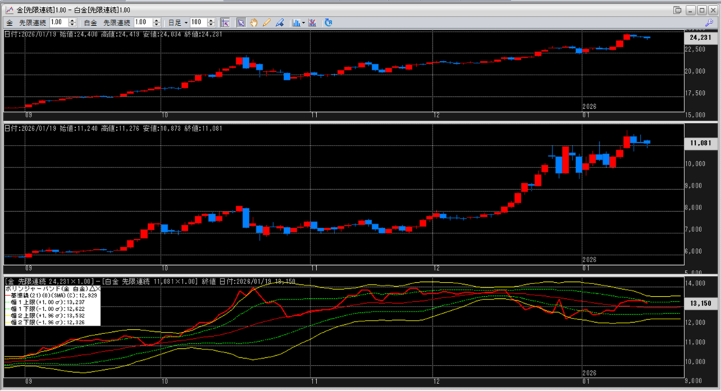 金白金の鞘をボリンジャーバンドで見ていきます。