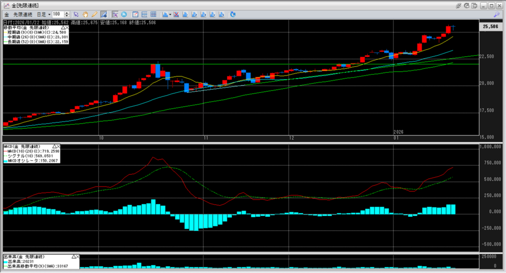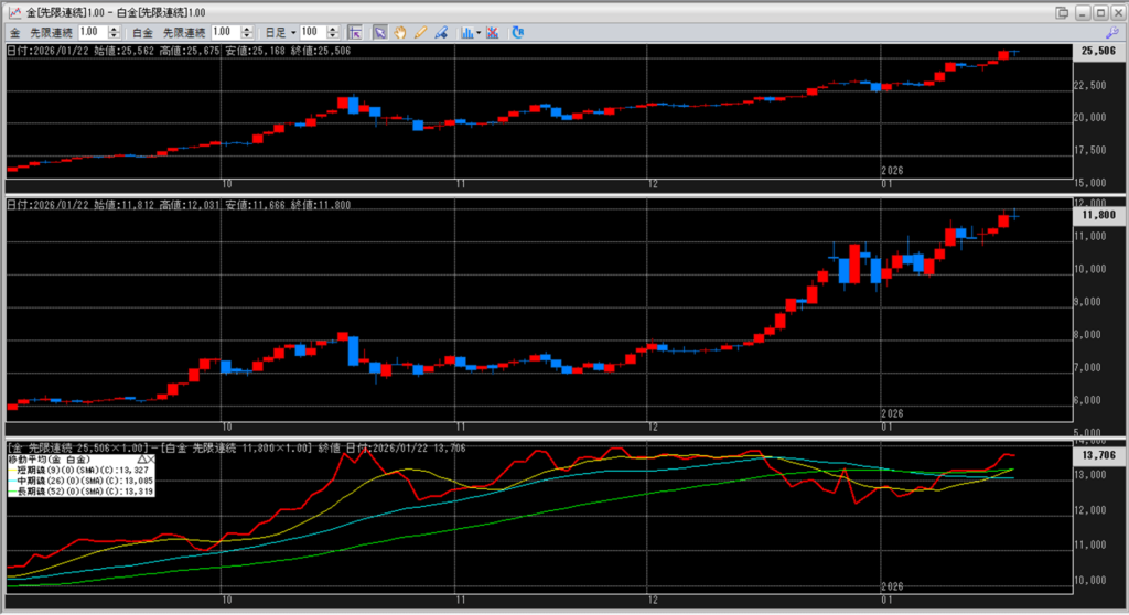 下記に金白金鞘の移動平均線のチャートを貼り付けています。