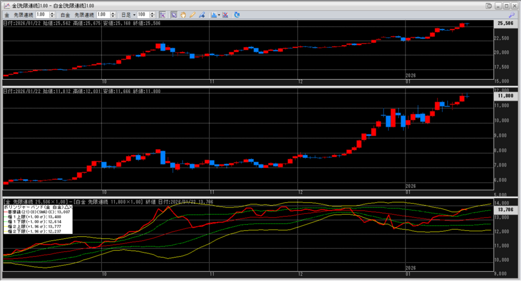 金白金の鞘をボリンジャーバンドで見ていきます。
