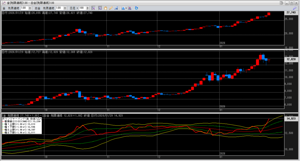 金白金の鞘をボリンジャーバンドで見ていきます。