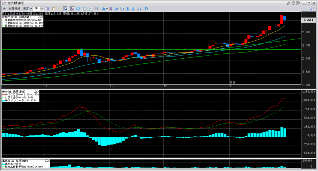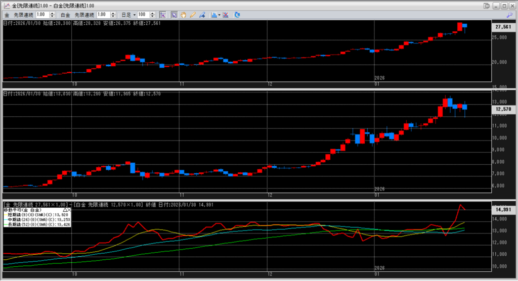 下記に金白金鞘の移動平均線のチャートを貼り付けています。