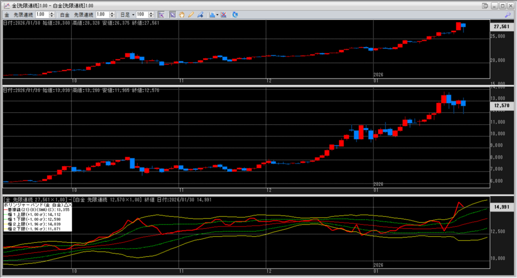 金白金の鞘をボリンジャーバンドで見ていきます。