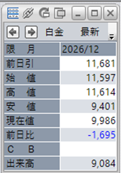 白金単体で見ると、前日比で-1,695円となっております。