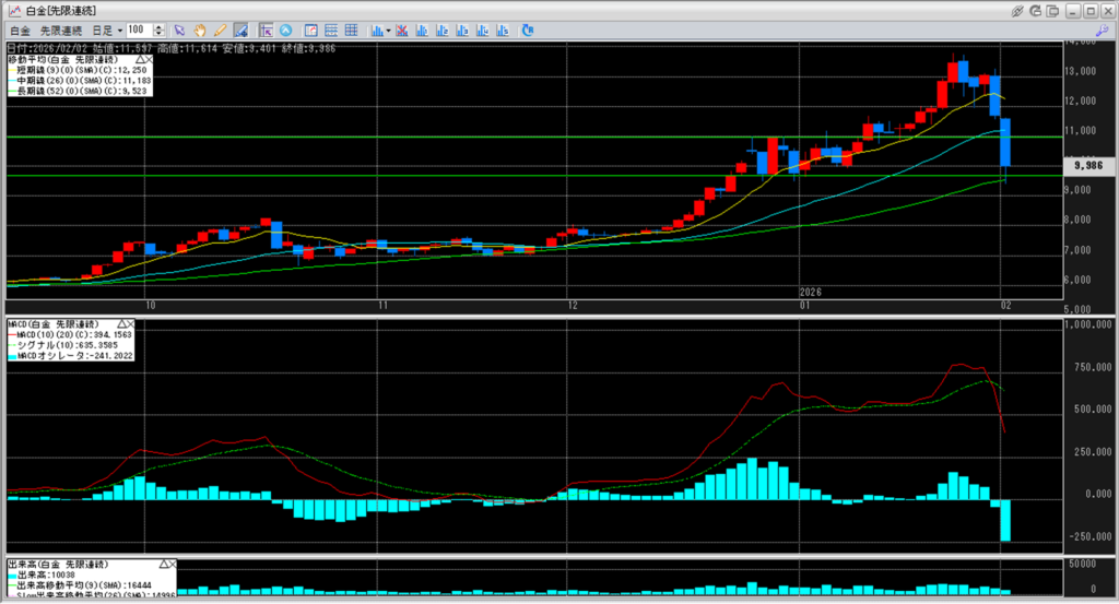 移動平均線は短期線、中期線と一気に割り込んできています。